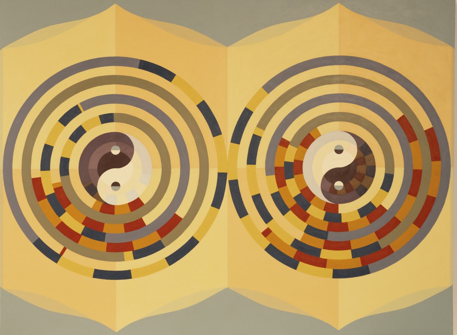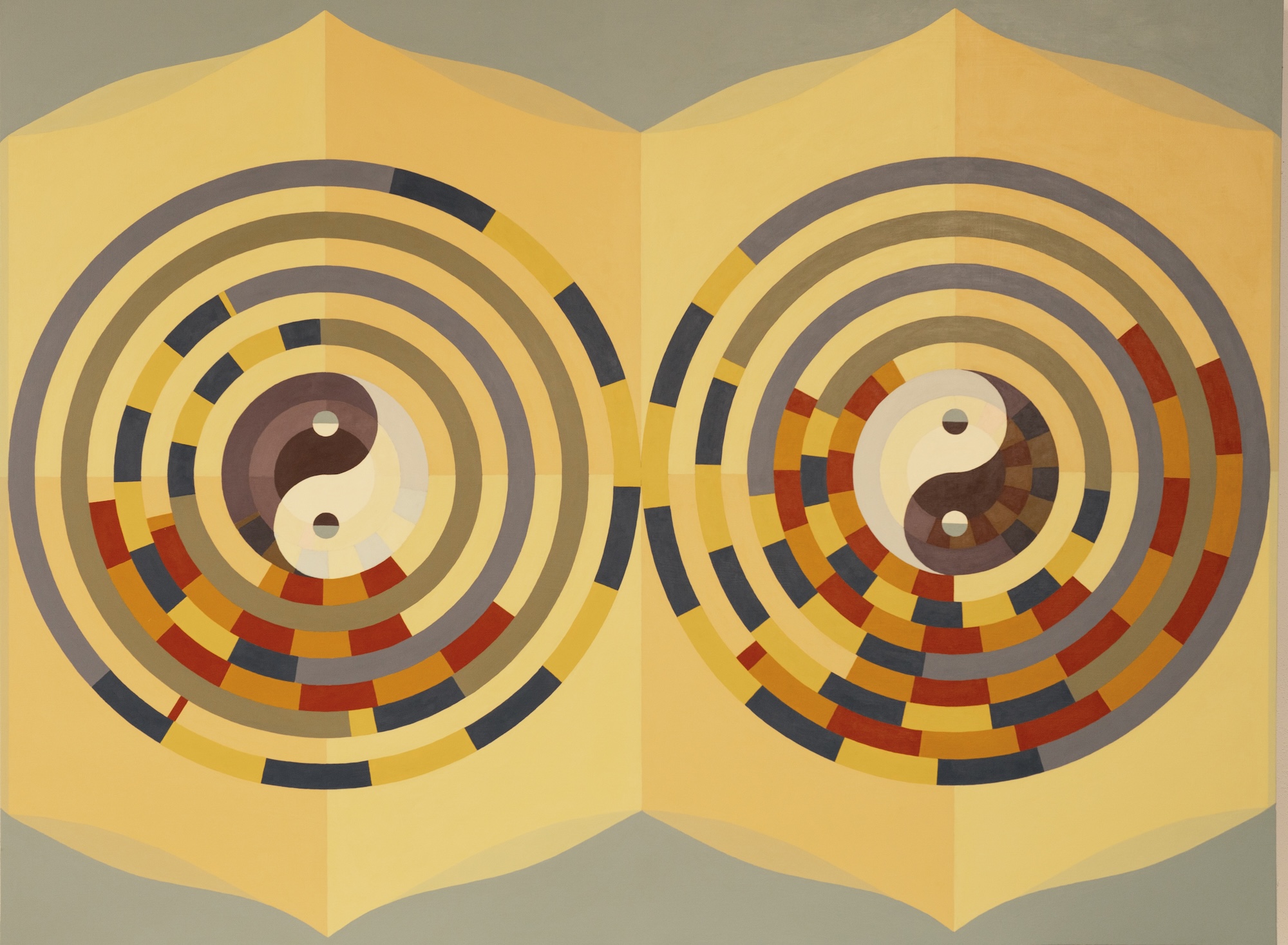 Chieko Murasugi employs personal symbols and visual illusions within an abstract language to access the realm of ideas. She visualizes the notion of chance by using a computer program to “roll the dice” and introduce randomized elements into ordered sequences and patterns. In these paintings, selected features are randomized within both traditional and novel patterns to create a balance between predictable and unstable perceptions. Chieko frequently employs the hexagon, a Japanese symbol of longevity and a shape that holds personal significance. By chance, her parents narrowly escaped the fires from M-69 incendiary bombs dropped on Tokyo during WWII, bombs housed in hexagon shaped containers. In other paintings, Chieko incorporates the recently discovered Einstein hat shape that is based upon the hexagon and creates tile patterns that do not repeat. Lack of repetition is a crucial characteristic of randomness.