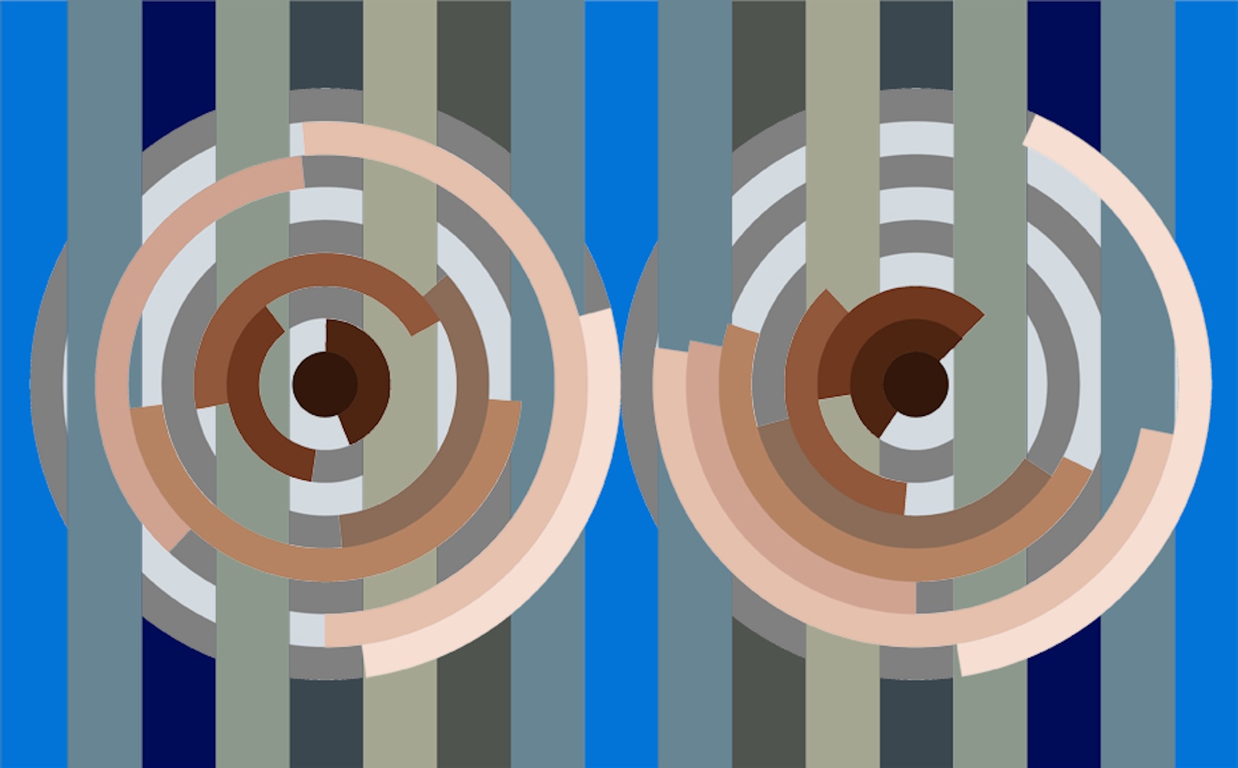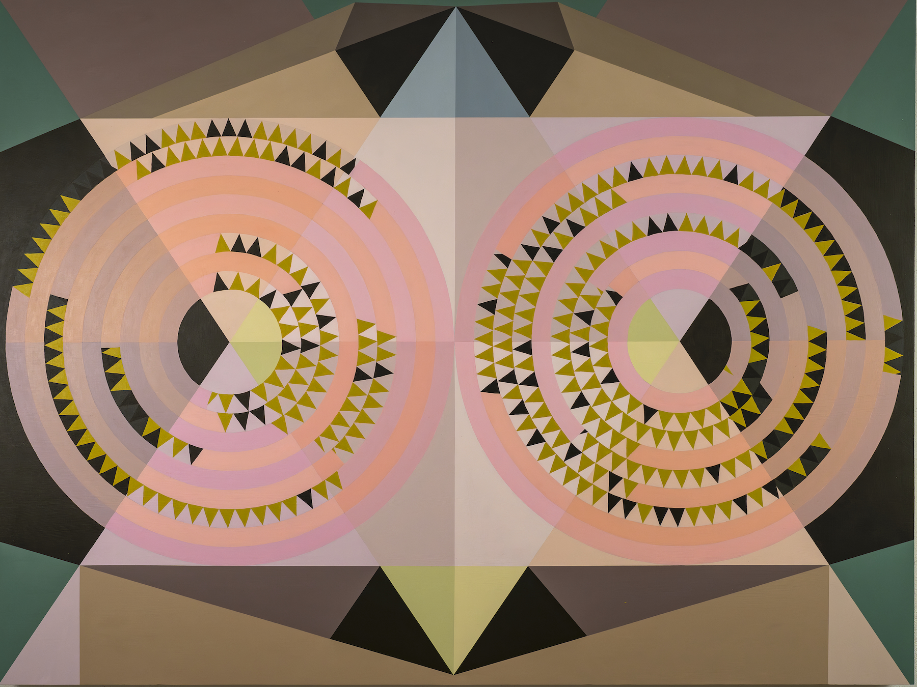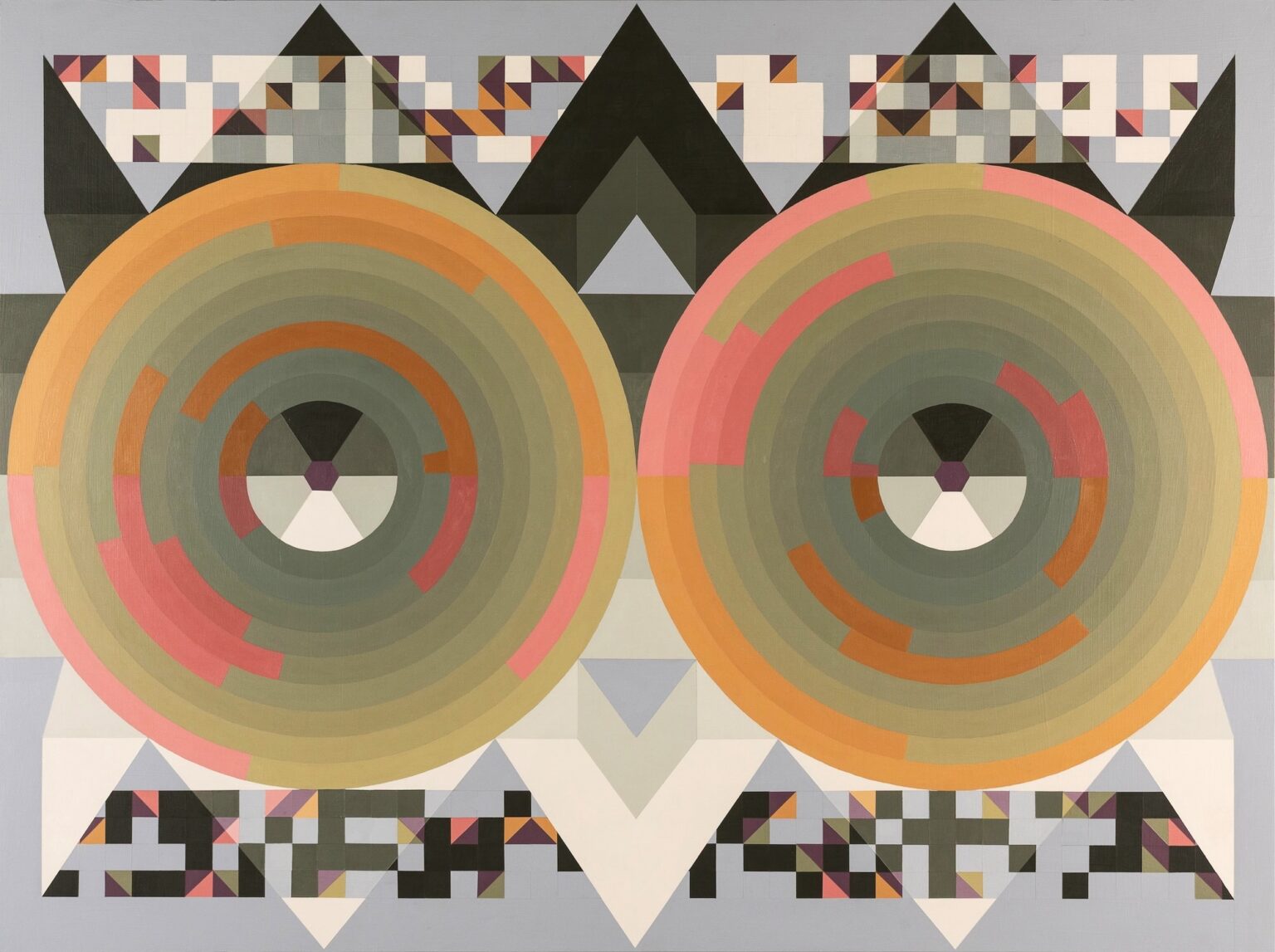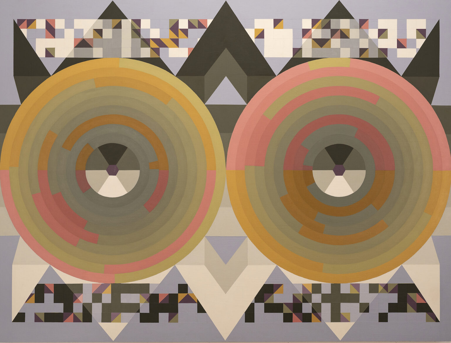 In my Deuce paintings, two large circular forms sit within a tightly organized geometric framework. Inside these circles, digital randomization gives form to chance while the surrounding structures remain deliberate and controlled. This contrast allows randomness to reveal itself clearly: clusters form, gaps appear, and both subtle and pronounced imbalances emerge.
