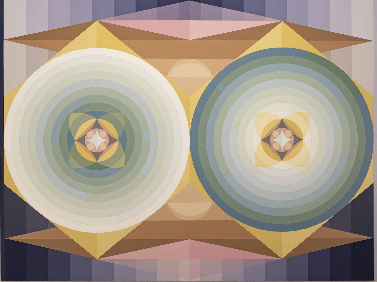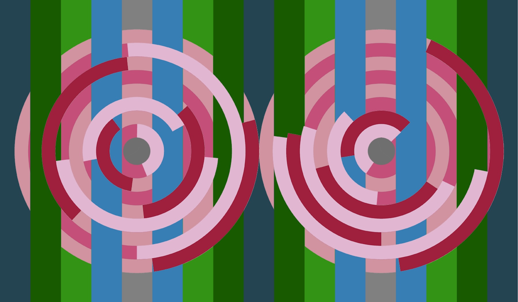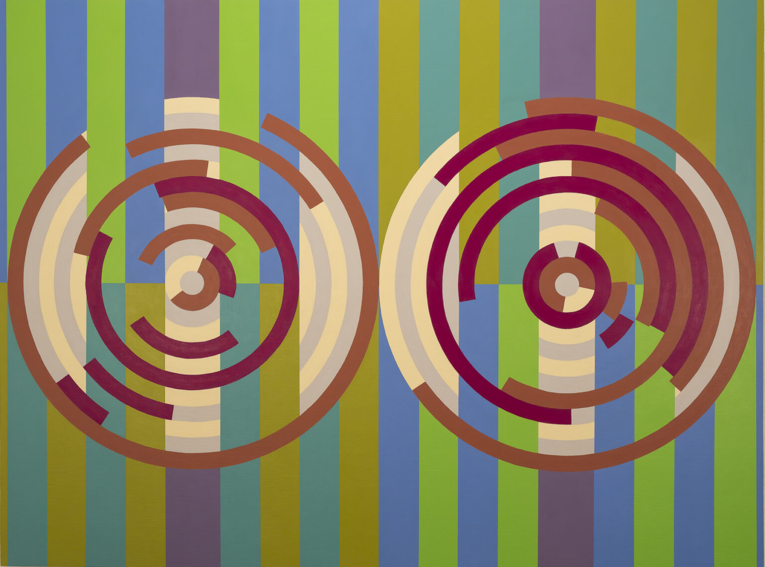 In my Deuce paintings, two large circular forms sit within a tightly organized geometric framework. Inside these circles, digital randomization gives form to chance while the surrounding structures remain deliberate and controlled. This contrast allows randomness to reveal itself clearly: clusters form, gaps appear, and both subtle and pronounced imbalances emerge.