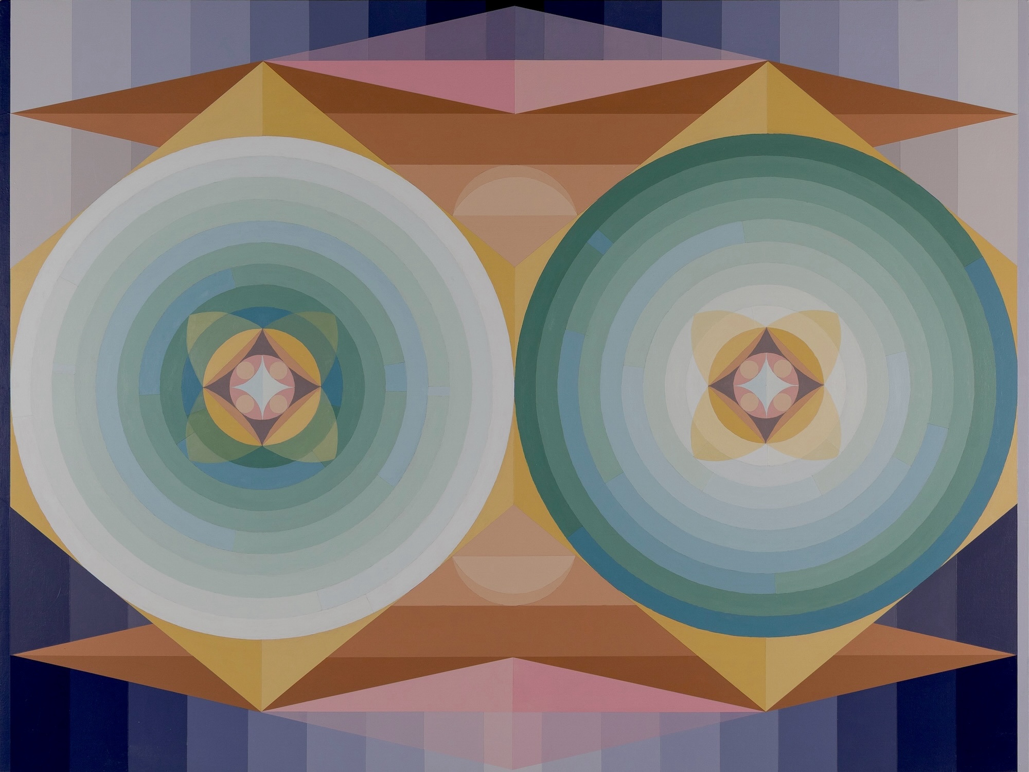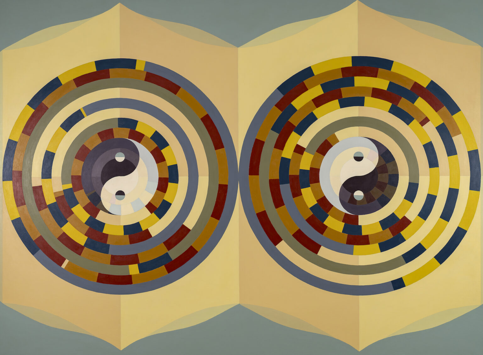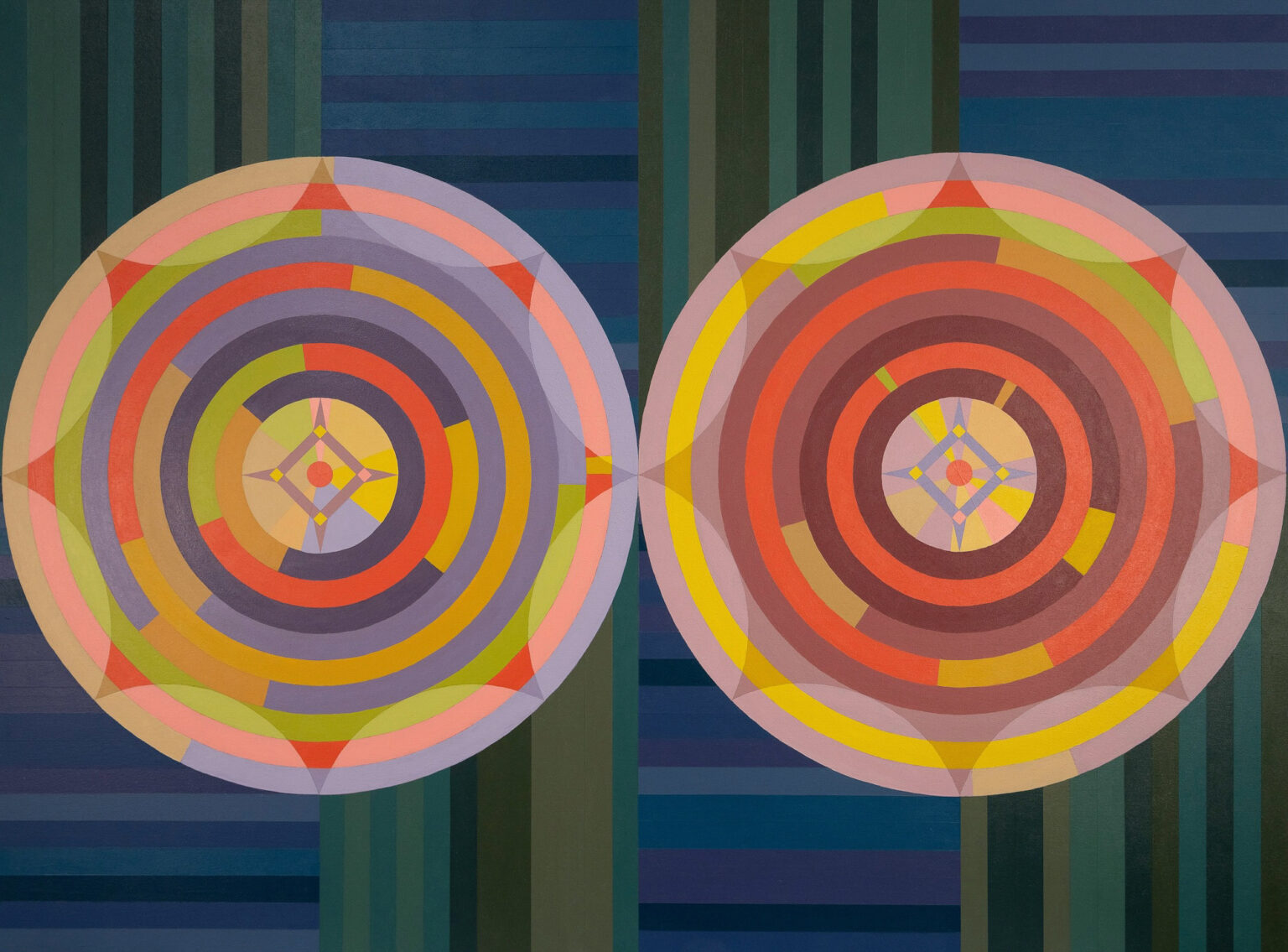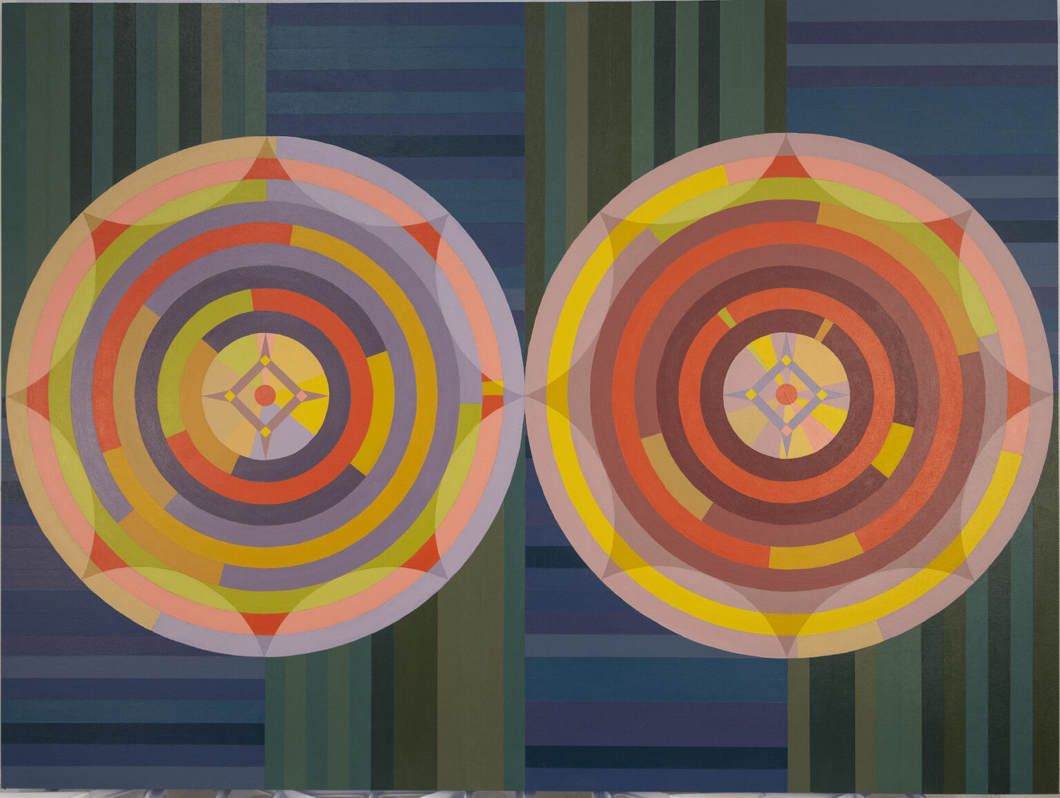 In my Deuce paintings, two large circular forms sit within a tightly organized geometric framework. Inside these circles, digital randomization gives form to chance while the surrounding structures remain deliberate and controlled. This contrast allows randomness to reveal itself clearly: clusters form, gaps appear, and both subtle and pronounced imbalances emerge.