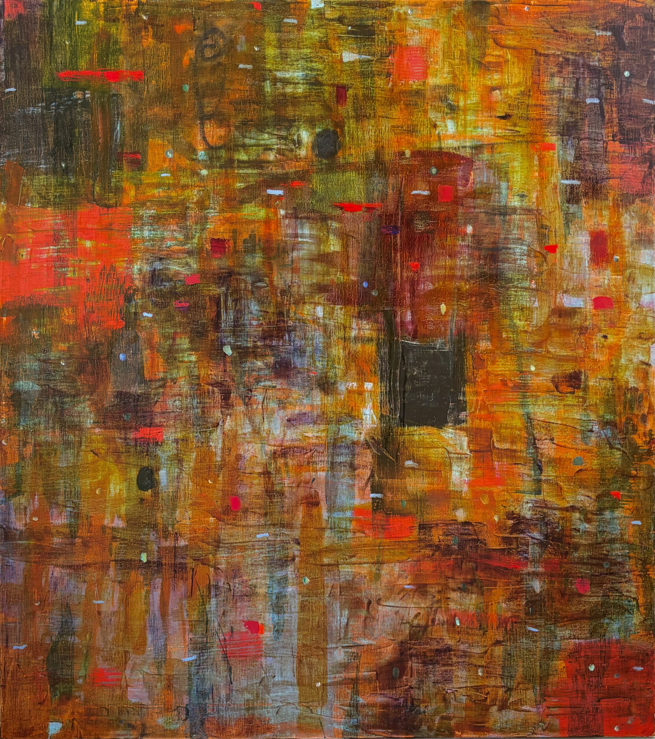 Every painting is an adventure, and as such, it often goes through many changes— paint applied, paint scrapped off, the surprise of pentimento— before arriving at a place that seems to be somewhere I didn’t know I was looking to go. The finished painting feels like finding something both forgotten and essential. I would like my paintings to communicate something of that discovery and to convey deep good feeling.