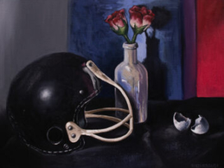 The theme comes again in “Growing Kid” (2024), where a triad of elements is in tension: a football helmet, a flower base, and a broken egg. It reminds the work of the Spanish painter Esteban Murillo (1617-1782). Murillo was also a pioneer in the genre, the first artist to paint ordinary life in the 17th century in his native town of Seville. During that time, Europe saw an extraordinary prosperity wave led by the Netherlands and its wide global commercial presence. Artists started painting everyday subjects and selling them in the open marketplace. In addition, this piece comments on Ortega’s role as a father and the passing of ancestral knowledge to the next generation.