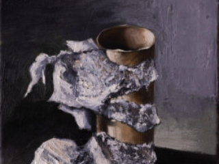 My new body of work, a collection of still-lifes made especially for this exhibition, arises from the stimulation of ideas through observation and introspection. To achieve multidimensionality using the formal tradition of easel painting with oils, I create a set in my art studio to display the objects. I paint in silence, focus on my breathing, and with an awareness of my body posture concerning the object I paint, forming a unit with the canvas and the easel. Painting is a physical experience; my process helps to create an environment where I can materialize the intangible, capturing the essence of what I see and experience.